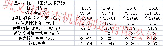 二.TH系列斗式提升機(jī)是一種常用的提升設(shè)備,該系列斗式提升機(jī)采用鍛造環(huán)鏈作為傳動(dòng)部分,具有很強(qiáng)的機(jī)械強(qiáng)度,主要用于提升機(jī)粉體和小顆粒及小塊狀物料,區(qū)別于TD系列斗式提升機(jī),其提升量更大、運(yùn)轉(zhuǎn)效率更高。其常用于較大比重的物料的提升。TH系列斗式提升機(jī)主要技術(shù)參數(shù)參考圖: